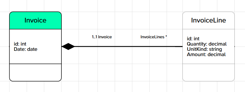 association composition Invoice (Invoice) 1..1 <>-- InvoiceLine (InvoiceLines) *;