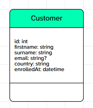 Properties are defined inside the classes with a type and can be declared optional (denoted with '?' as a postfix of the type) or mandatory in other case. Note the optional mark is indicated in the type and not in the property. Types are specified before the property name.
